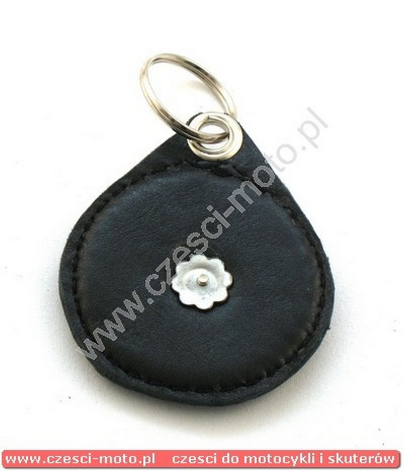 Brelok wykonany ze skóry bydlęcej galanteryjnej, ozdobiony znaczkiem motocyklowym.