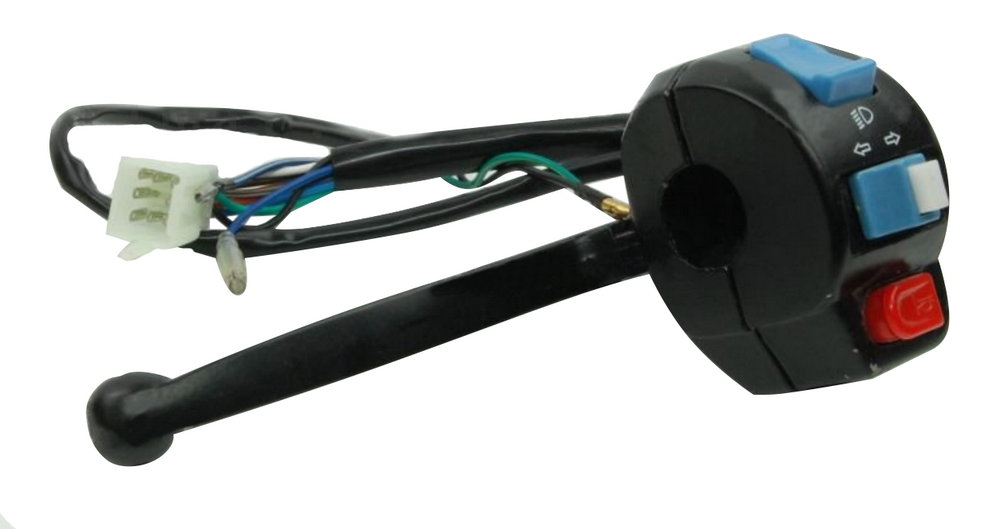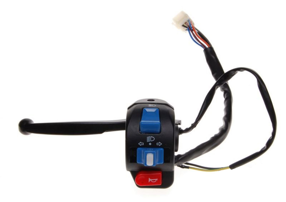 Przełącznik zespolony do skuterów, motorowerów, do założenia na kierownicę o średn. 22 mm. Jest solidnie wykonany z obudową wykonaną z plastiku. Przełącznik posiada klamkę i otwór na lusterko M8.