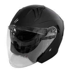Łatwy do założenia, wygodny i bezpieczny. Szyba opuszczona pod podbródek zabezpiecza przed zawirowaniom powietrza na twarz.