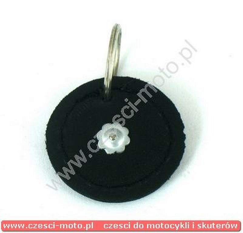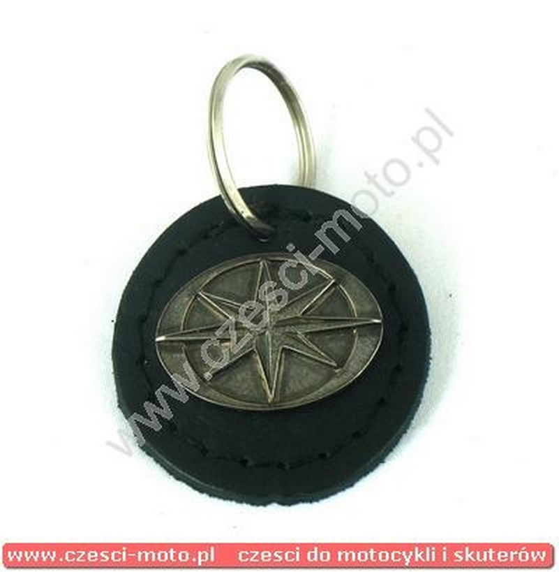 Brelok wykonany ze skóry bydlęcej galanteryjnej, ozdobiony znaczkiem motocyklowym. Zakończony jest karabinczykiem do którego można przypiąć łańcuch z portfelem lub kluczami.