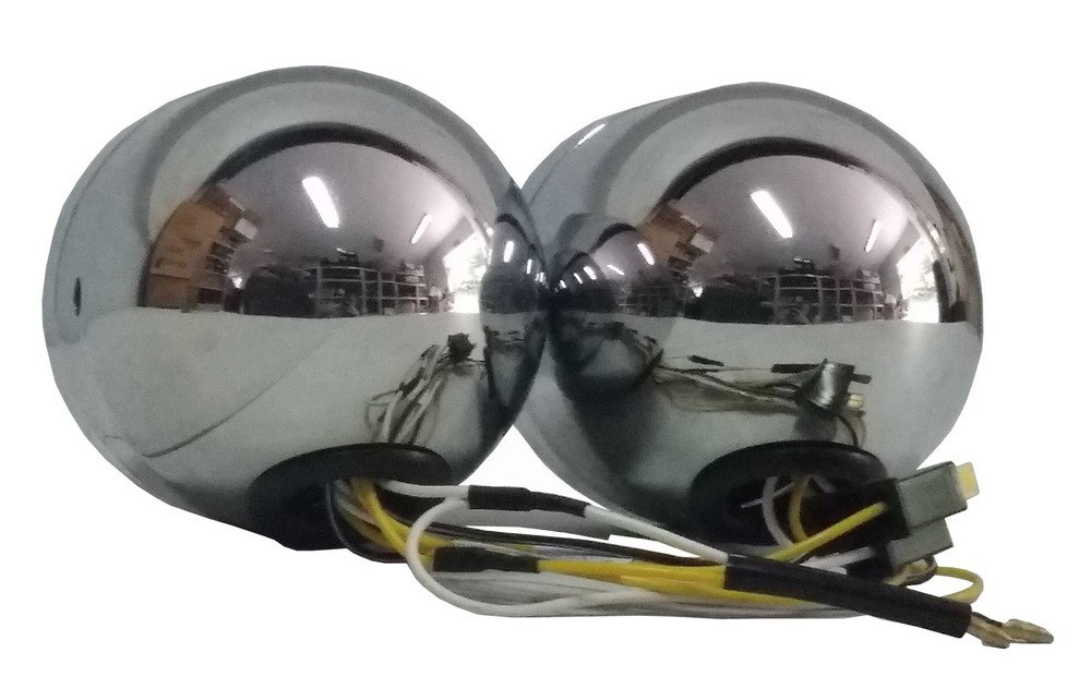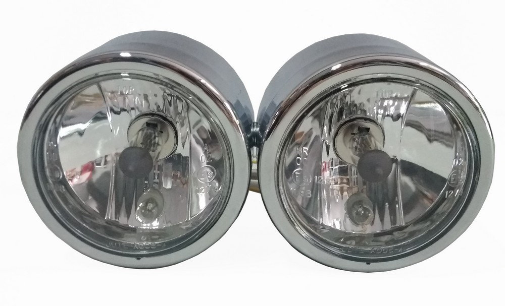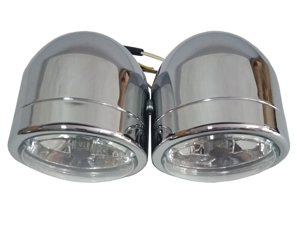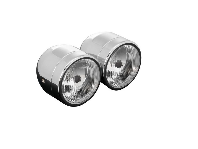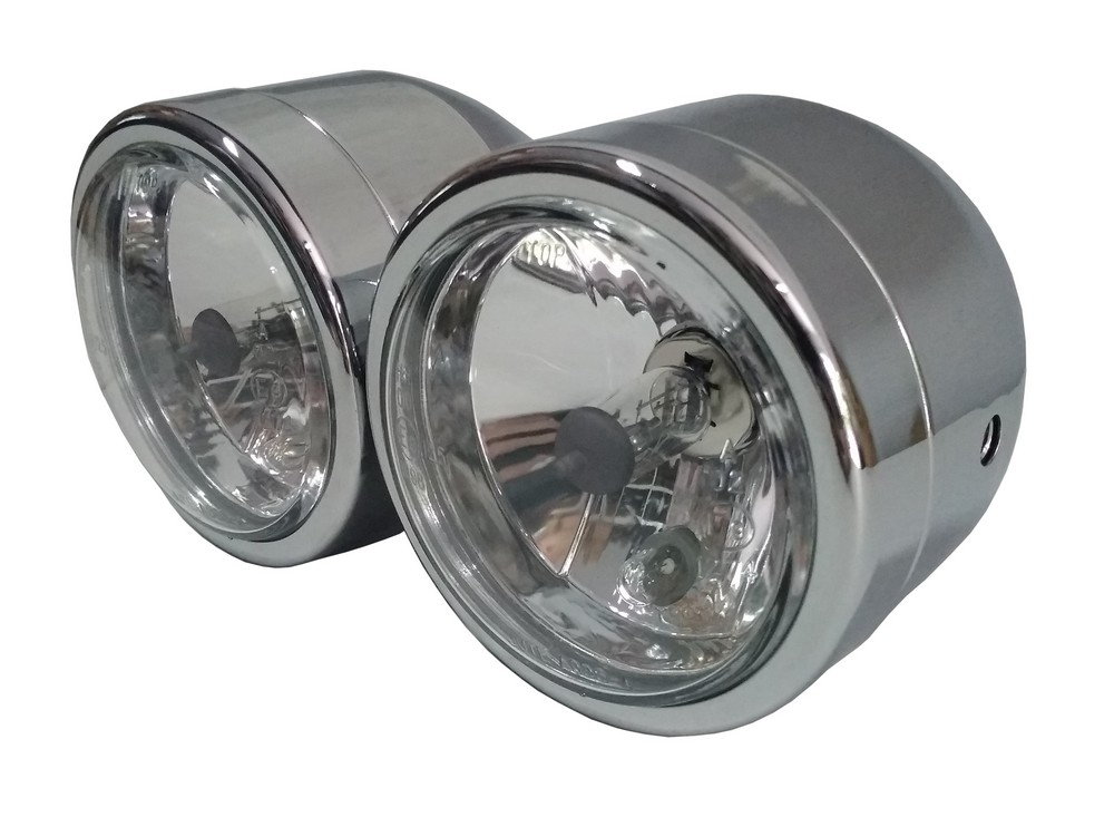 Lampa motocyklowa przednia, podwójna, uniwersalna - obudowa metalowa, chromowana.