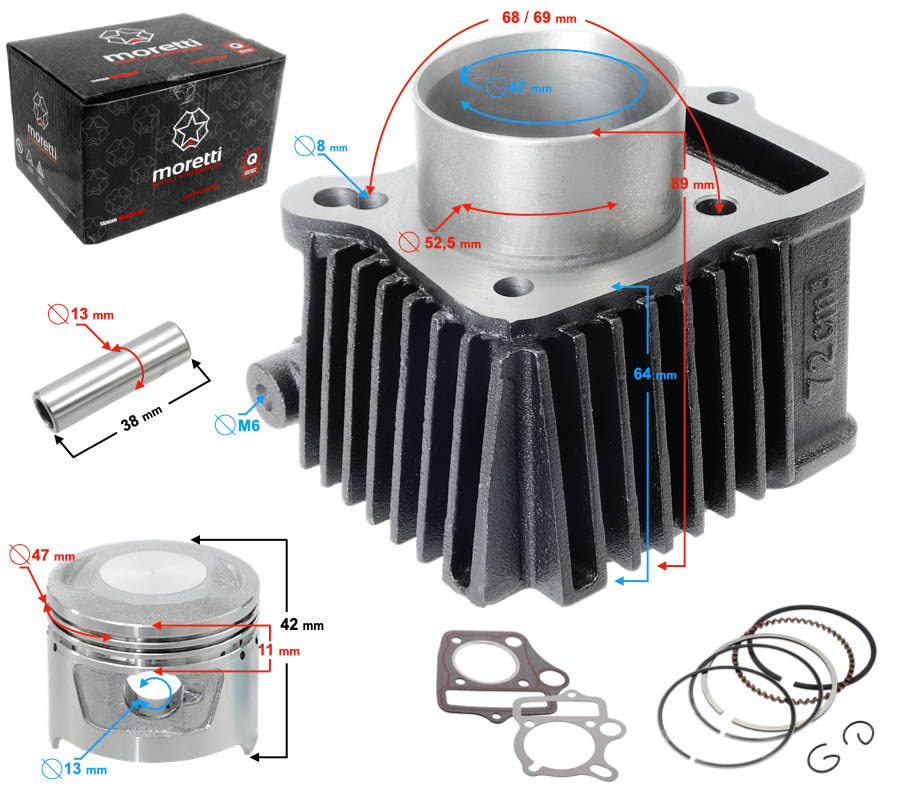 Cylinder do motorowera zwiększający pojemność silnika do 72ccm. Jest to najprostsza metoda zwiększenia mocy pojazdów o standardowych pojemnościach 50ccm. Po montażu wskazana jest regulacja gaźnika i zwiększenie zasilania paliwem poprzez podniesienie iglicy. Zalecane jest zastosowanie irydowej świecy zapłonowej lub przynajmniej o zwiększonej ciepłocie (np. 9) oraz stosowanie oleju full syntetyk.