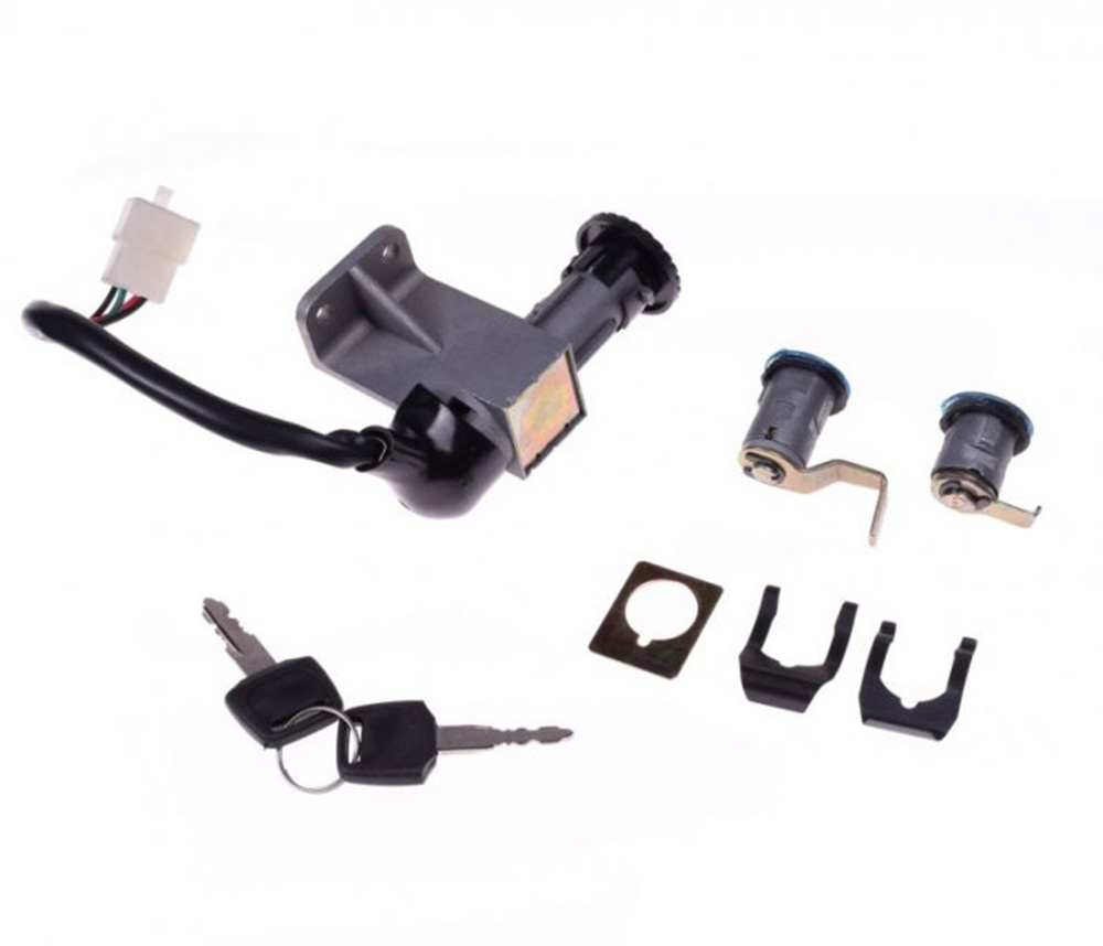 Stacyjka do popularnych skuterów, z charakterystycznym wlewem paliwa. Przewód zakończony wtyczką na 4 piny. W komplecie: 2 kluczyki, stacyjka z blokadą kierownicy, zamek klapki wlewu oleju oraz zamek schowka pod siedzeniem.