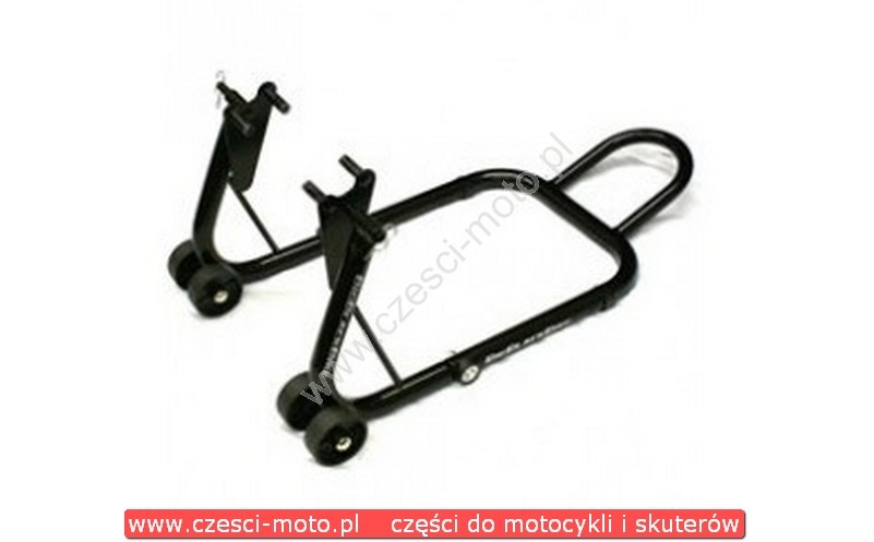 Podstawowy podnośnik motocykla pod przednie zawieszenie. Wzmacniania konstrukcja zapewni stabilny uchwyt motocykla oraz rolki (kółeczka) pozwolą na podniesienie motocykla. System mocowania opiera się na rolkach, które wkłada się pod przednie zawieszenie.