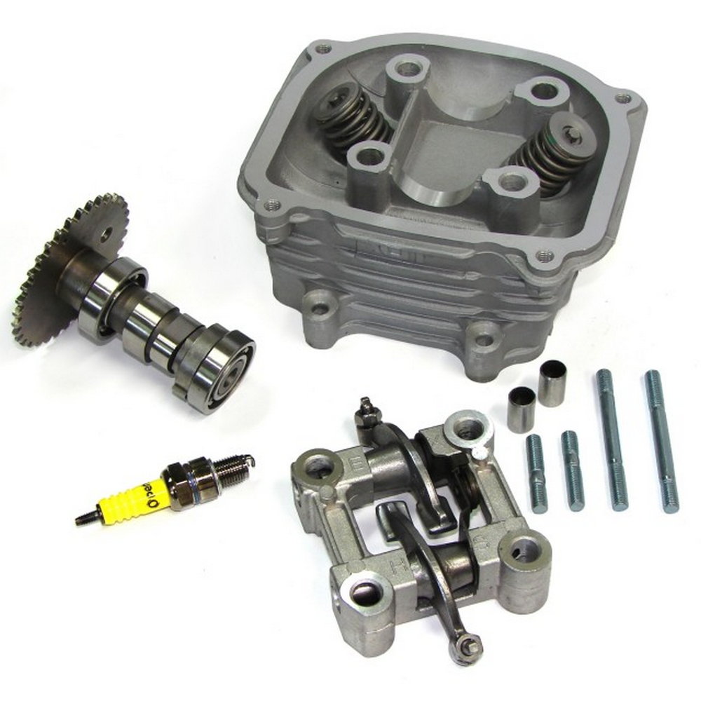 W komplecie zawory, wałek rozrządu, szpilki, klawiatura z dźwigienkami oraz świeca zapłonowa
