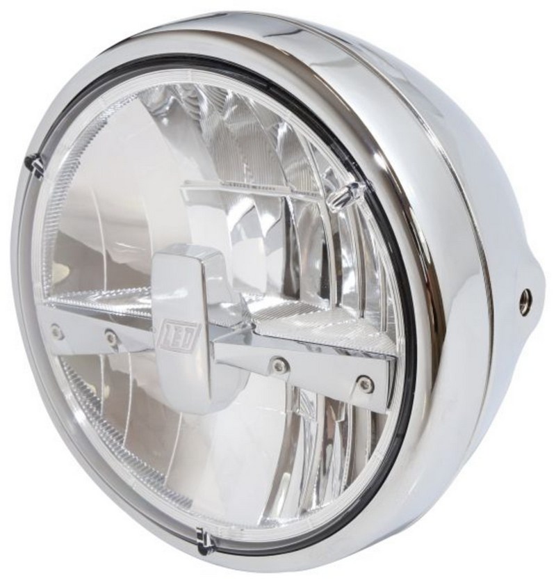 Lampa motocyklowa przednia, uniwersalna - obudowa metalowa, chromowana - RENO III