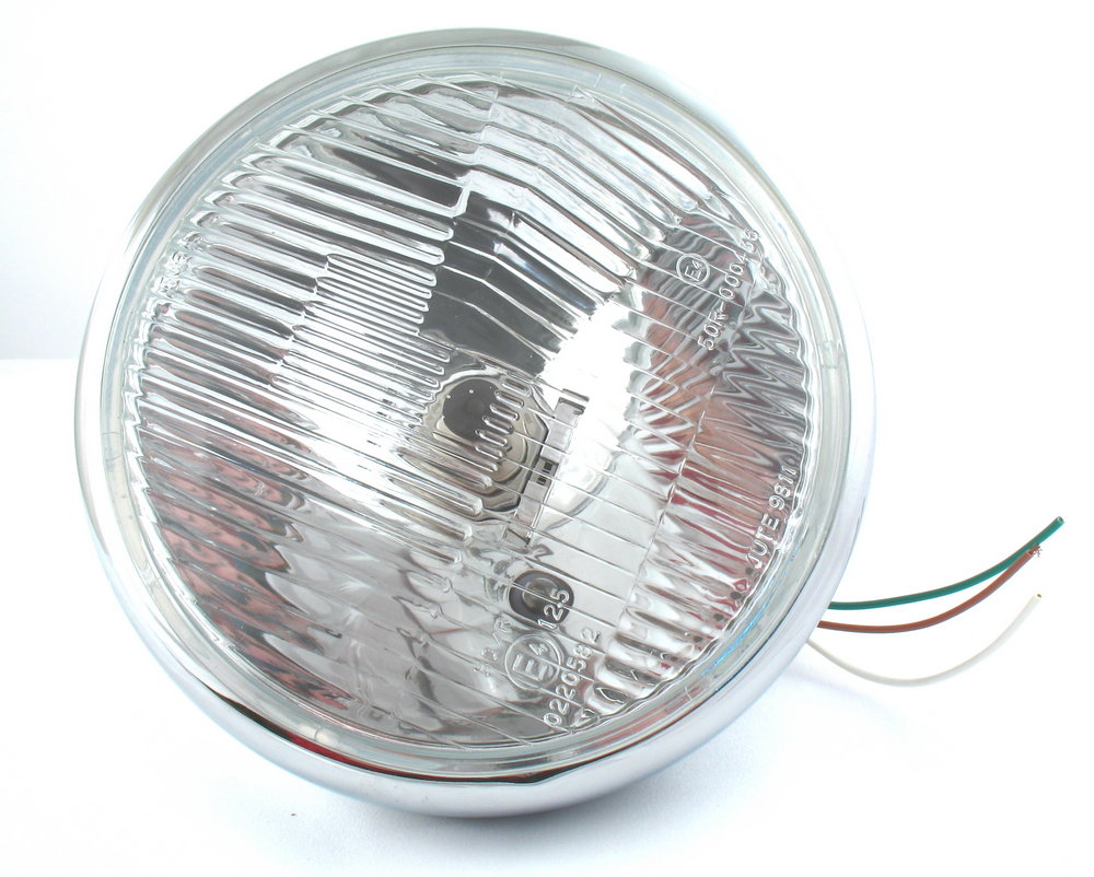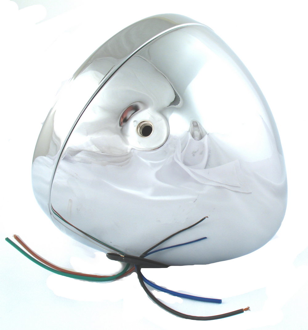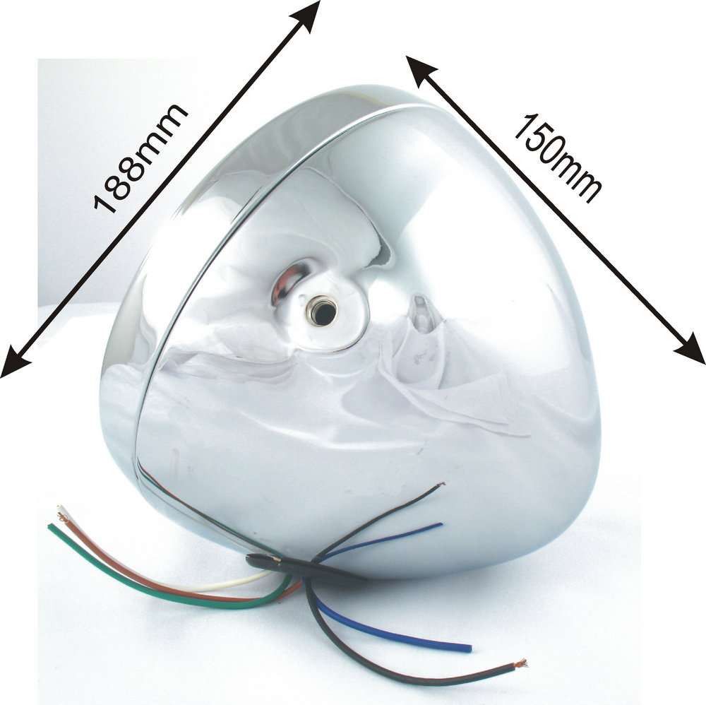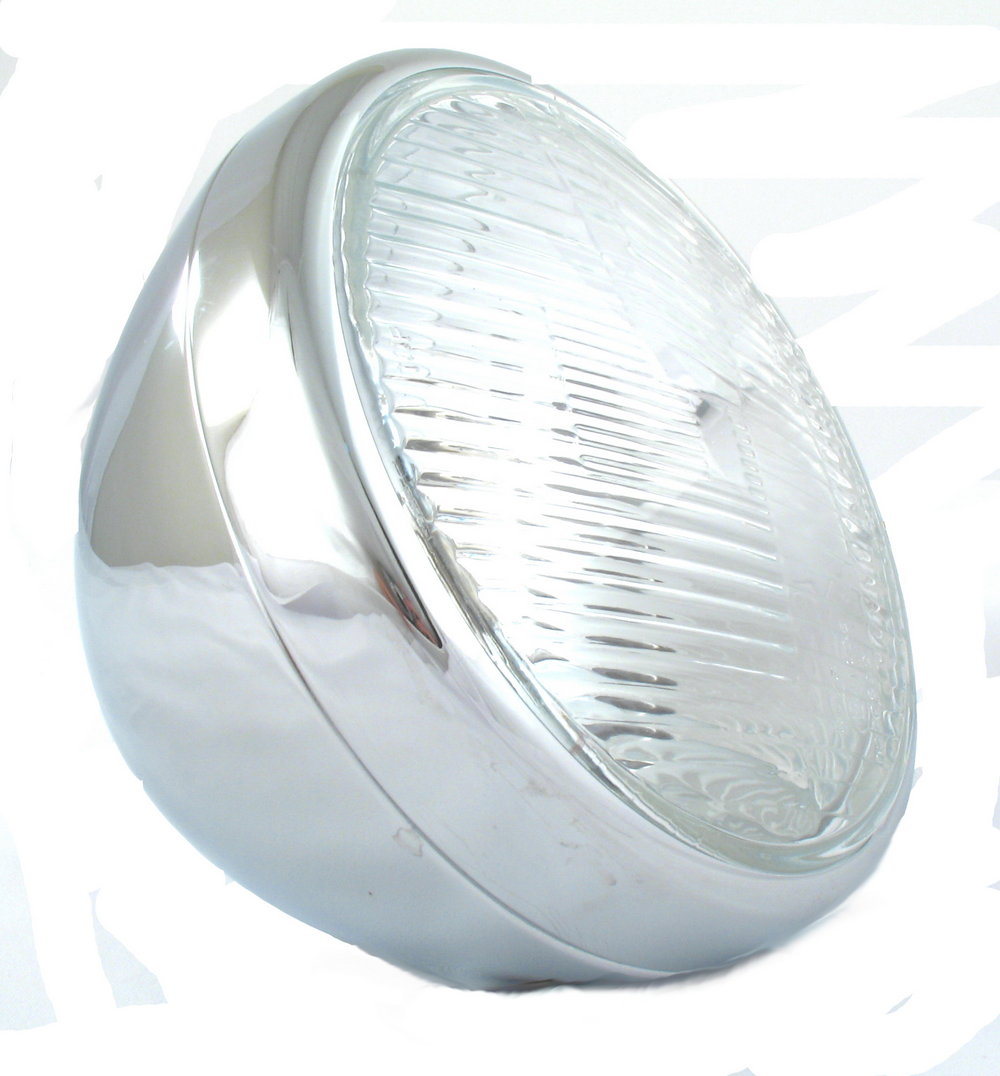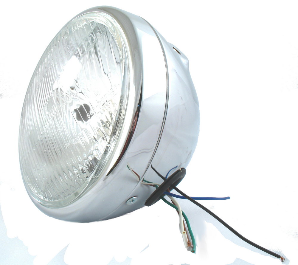 Nowa lampa motocyklowa przednia (DUŻA) uniwersalna - obudowa metalowa, chromowana, żarówka H4 12V 60/55W (światła mijania i drogowe) oraz żarówka postojowa.