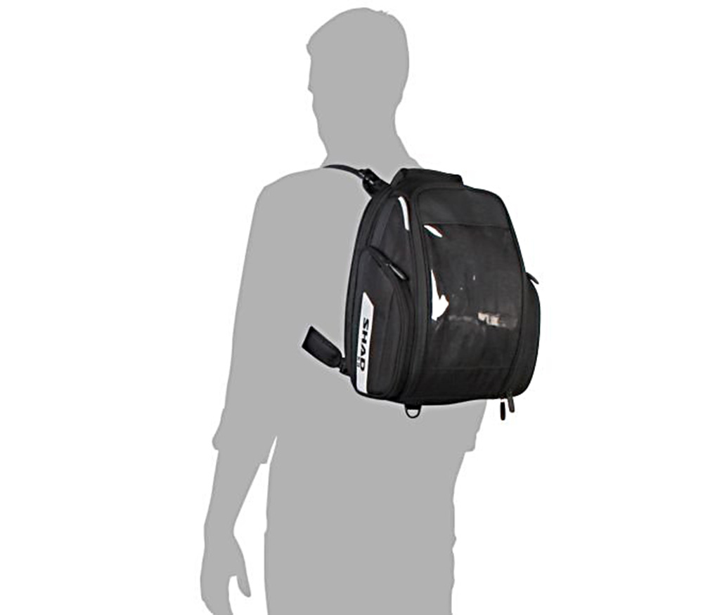 - tankbag po odpięciu od panelu mocującego służy jako plecak. Posiada regulowane paski i pas biodrowy wyściełany miękką siateczką dla wygody noszenia (w zestawie)