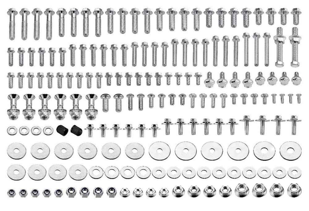 Zestaw 179-częściowy śrub, nakrętek, podkładek i innych drobnych elementów, przeznaczonych do motocykli japońskich.