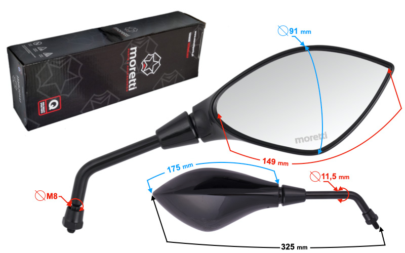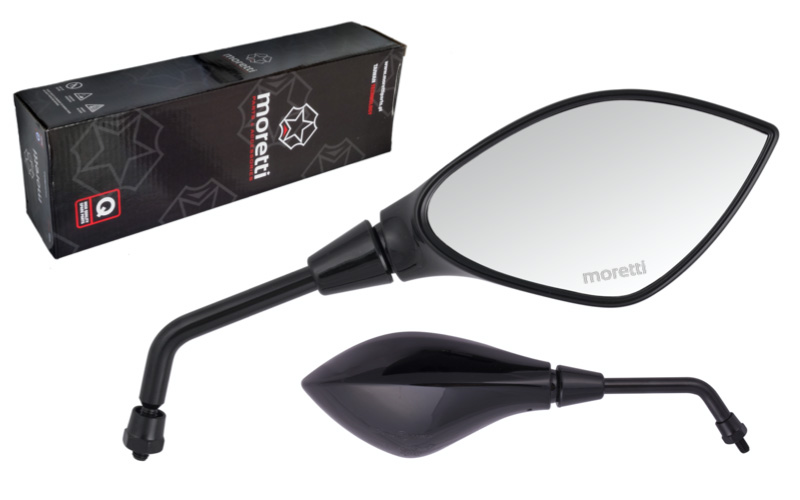 Czarne lusterka o opływowym kształcie. Wykończenie na wysoki połysk sprawia, że pasują do wielu modeli. Bardzo wysoka jakość wykonania oraz ogromna dbałość o szczegóły. Idealnie pasują do motorowerów, skuterów oraz motocykli typu naked. Mocowane są na solidnym metalowym uchwycie o średnicy gwintu 8 mm.