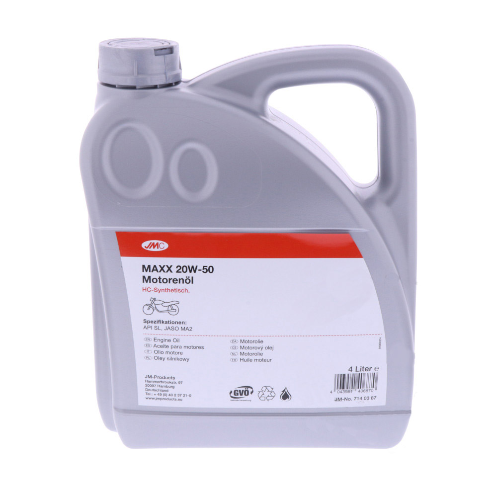 Wysokowydajny olej silnikowy JMC MAXX 20W-50 TWIN HC- synt, opracowany specjalnie do stosowania w chłodzonych powietrzem 2-cylindrowych 4-suwowych motocyklach ze sprzęgłem pracującym w mokrej kąpieli olejowej. Bazę olejową poddaje się procesowi hydrocrackingu (HC), co czyni produkt finalny zbliżony parametrami do olejów syntetycznych, przy zachowaniu niewysokiej ceny produktu.
