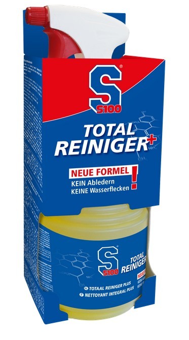 Spryskaj cały motocykl preparatem S100 Total Reiniger Plus. Pozostaw preparat na motocyklu na 5 do 30 minut w zależności od stopnia zabrudzenia. Jeśli będzie konieczne użyj gąbki. Następnie dokładnie spłucz motocykl silnym strumieniem wody i pozostaw go do wyschnięcia lub użyj ściereczki z irchy w celu wysuszenia miejsc, z których woda nie może spłynąć. Motocykl schnie sam bez używania ściereczki i bez pozostawiania zacieków.