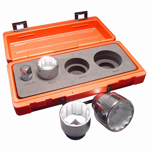 Profesjonalny zestaw trzech nasadek i adaptera do obsługi kół tylnych motocykli z monowahaczem.