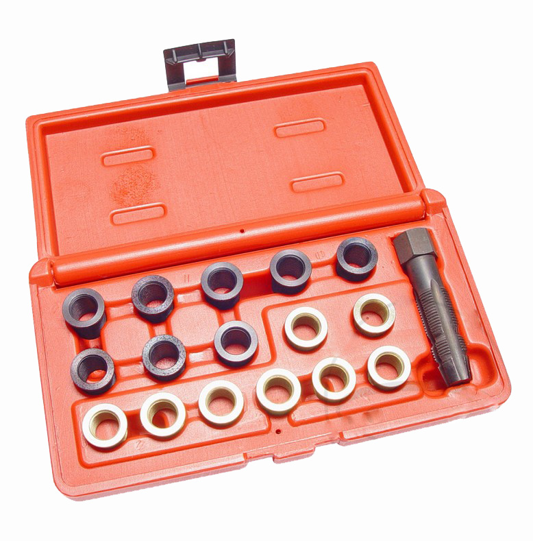Zestaw do profesjonalnej naprawy uszkodzonych gniazd świec zapłonowych M12 w silnikach motocyklowych.