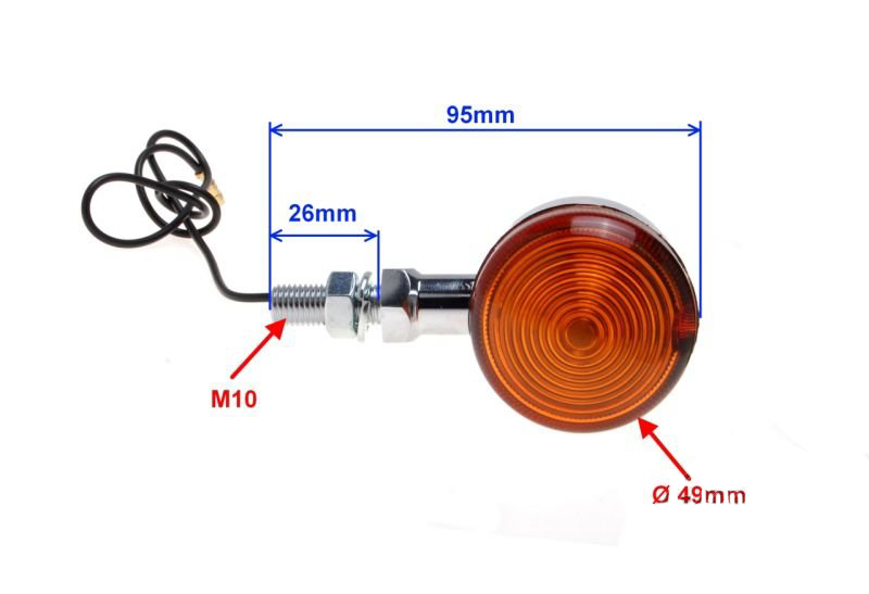 Kierunkowskaz posiada żarówkę 12V 23W, przewód z końcówką konektorową.