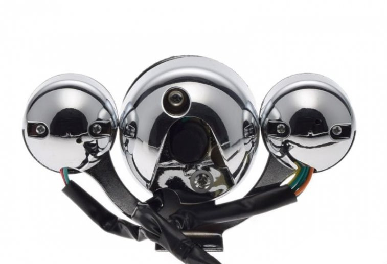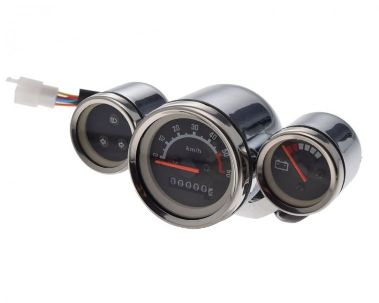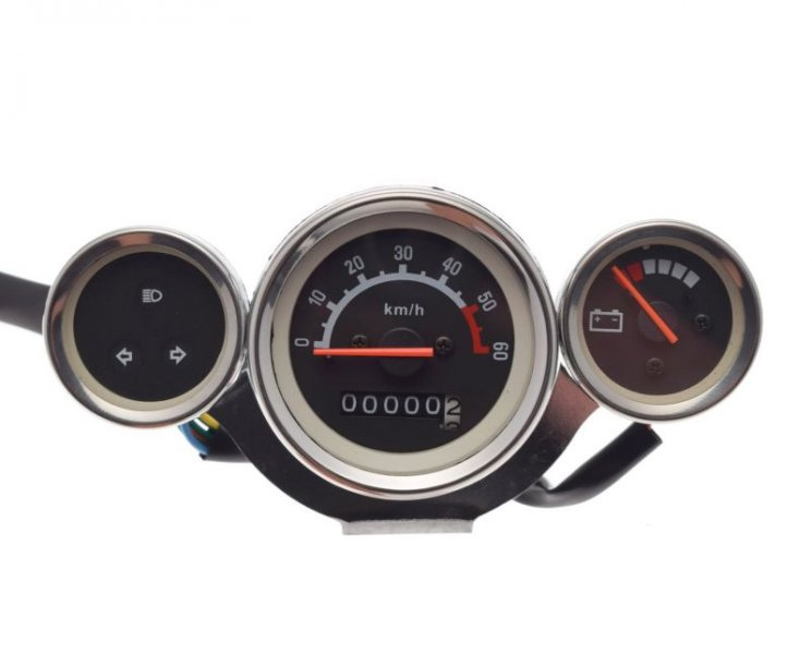 Licznik z trzema zegarami: główny prędkościomierz z białym cyberblatem, wskaźnik naładowania akumulatora oraz wskaźnik kierunkowskazów i świateł drogowych. Przed zakupem proszę porównać czy część oryginalna jest tego samego typu. Zdarzają się modyfikacje z zupełnie innymi podzespołami.