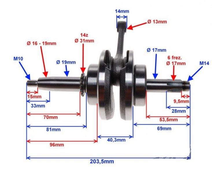 Wał korbowy kompletny z łożyskami i korbowodem.