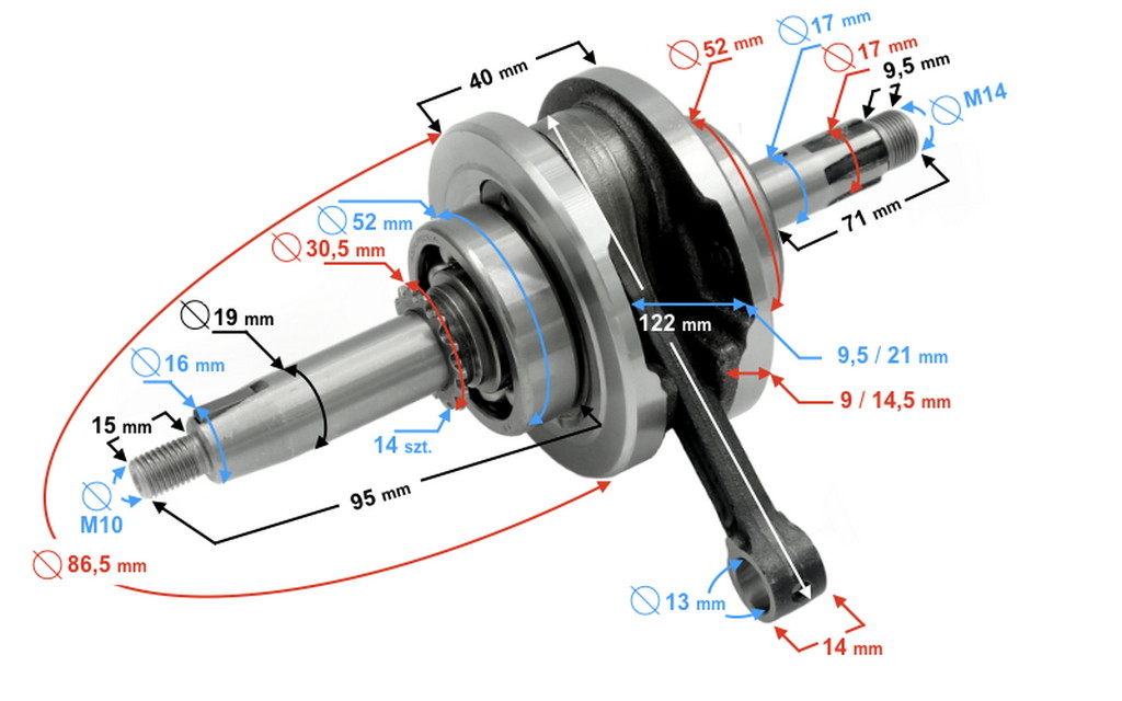 - szerokość sworznia korbowodu: 14 mm