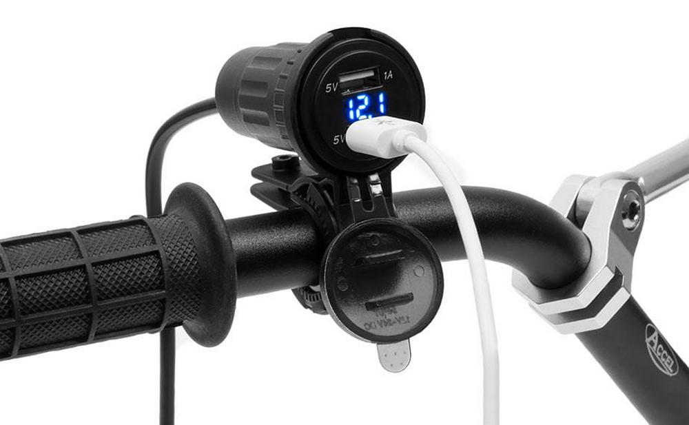 Motocyklowe gniazdo zapalniczki z wyjściami USB mocowane do kierownicy. Gniazdo posiada podświetlenie w kolorze niebieskim oraz woltomierz pokazujący napięcie prądu na wejściu do gniazda natomiast po wyłączeniu zapłonu napięcie w akumulatorze (w zależności od sposobu podłączenia do instalacji).