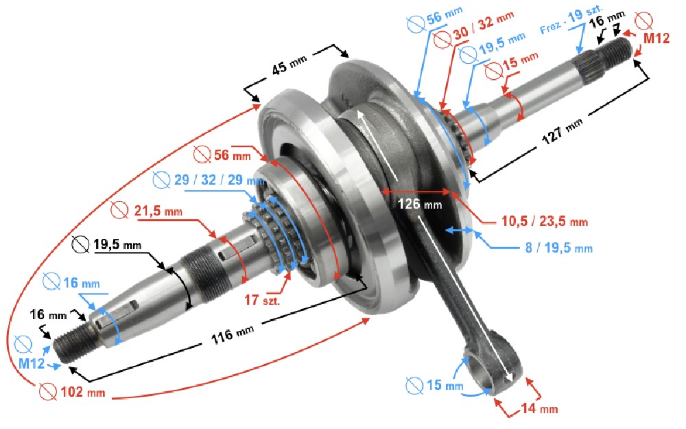 - długość całkowita dłuższego ramienia wału: 126 mm