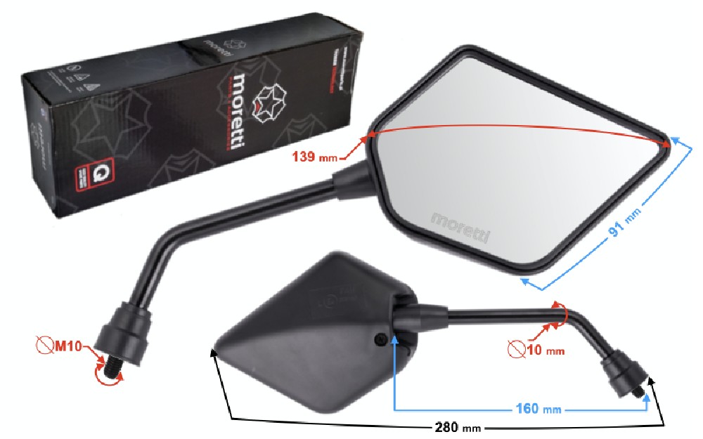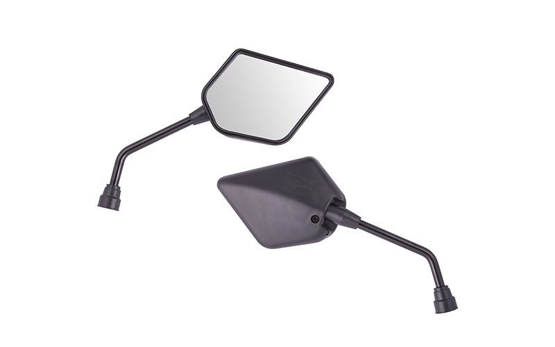 Czarne matowe lusterka o nowoczesnym kształcie. Posiadają możliwość przegubowej regulacji kąta widzenia, dzięki której możliwe jest indywidualne dopasowanie ustawień do własnych potrzeb. Mocowane są na solidnym metalowym uchwycie o średnicy gwintu 10 mm. Miejsca łączenia uchwytu zabezpieczone są estetycznymi gumowymi osłonami.