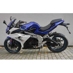 Motocykl wyposażony jest w tarcze hamulcowe zarówno z przodu, jak i z tyłu, co gwarantuje skuteczne i pewne hamowanie w różnych warunkach drogowych.