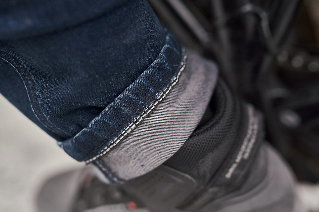Jeansy motocyklowe DEVON dbają również o Twoje bezpieczeństwo i dobrą widoczność po zmroku. Posiadają bowiem odblaskowe przeszycia na dole nogawki, które stanowią także ciekawy element designu.