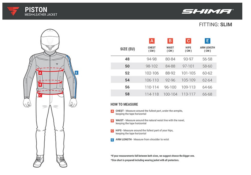 Ta motocyklowa kurtka została stworzona dla zapewnienia doskonałej ochrony i komfortu. Wykonana z najwyższej jakości skóry klasy A+ i specjalnej tkaniny Mesh zapewnia zarówno oddychalność, jak i trwałość. W standardzie PISTON wyposażono w certyfikowany system ochrony SHIMA ArmorPlus CE na plecach oraz certyfikowane protektory na ramionach i łokciach. Ochraniacze wykonane są w technologii otwartokomórkowego PU, który w normalnych warunkach swobodnie i niezauważalnie współpracuje z ciałem. Pod wpływem nagłego uderzenia materiał szybko twardnieje, pochłaniając większą część uderzenia. PISTON umożliwia rozszerzenie systemu ochrony dzięki możliwości zamontowania akcesoryjnego ochraniacza klatki piersiowej SAS-TEC. Protektor klatki piersiowej jest sprzedawany oddzielnie.