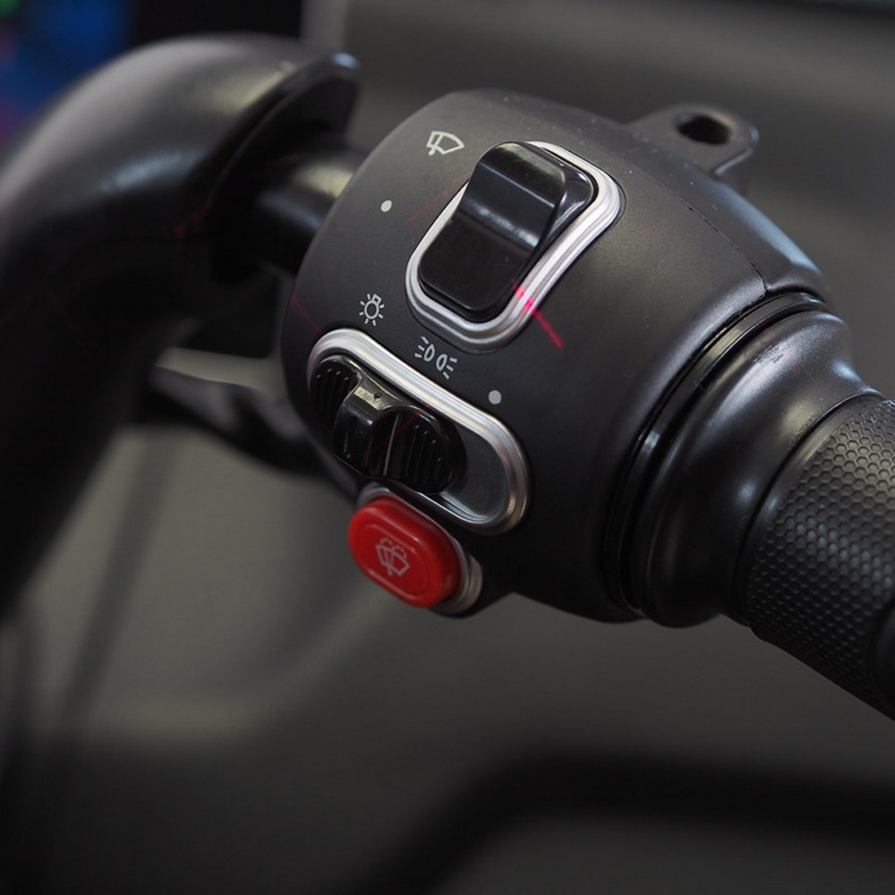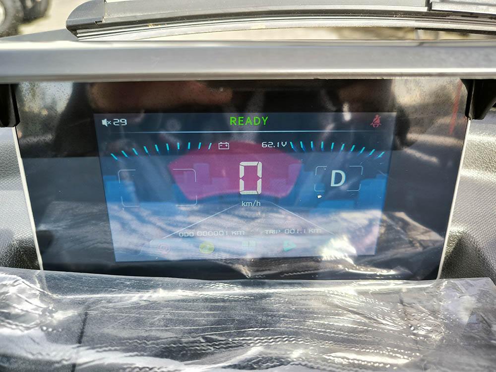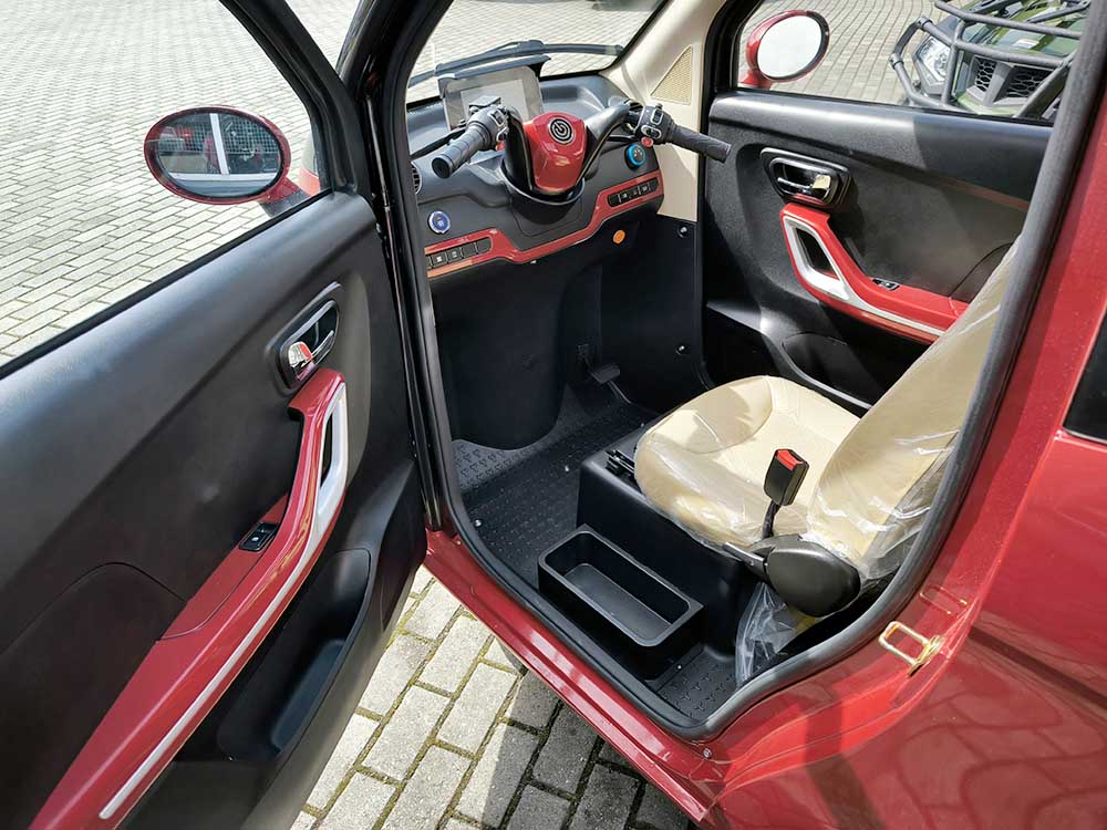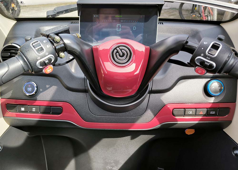 Pojazd elektryczny zabudowany ARIEL 4 posiada bieg wsteczny wraz z kamerą cofania. Na 7 calowym cyfrowym wyświetlaczu pojawiają się informacje nt. prędkości - jak w samochodzie. Mamy typową okrągłą kierownicę jak w standardowym samochodzie. Światła LED oświetlają wyśmienicie drogę. Maksymalny zasięg na jednym ładowaniu to ok 60 km, a wzniesienia jakie może pokonać ten pojazd do 15°.