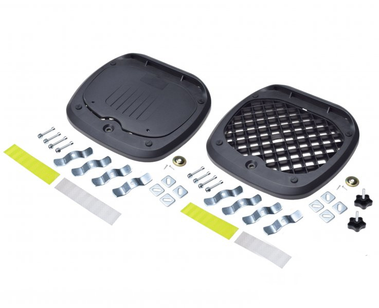 - Płyty montażowe: W zestawie znajdują się dwie płyty montażowe, które umożliwiają łatwe przymocowanie kufru do stelaża motocykla.
