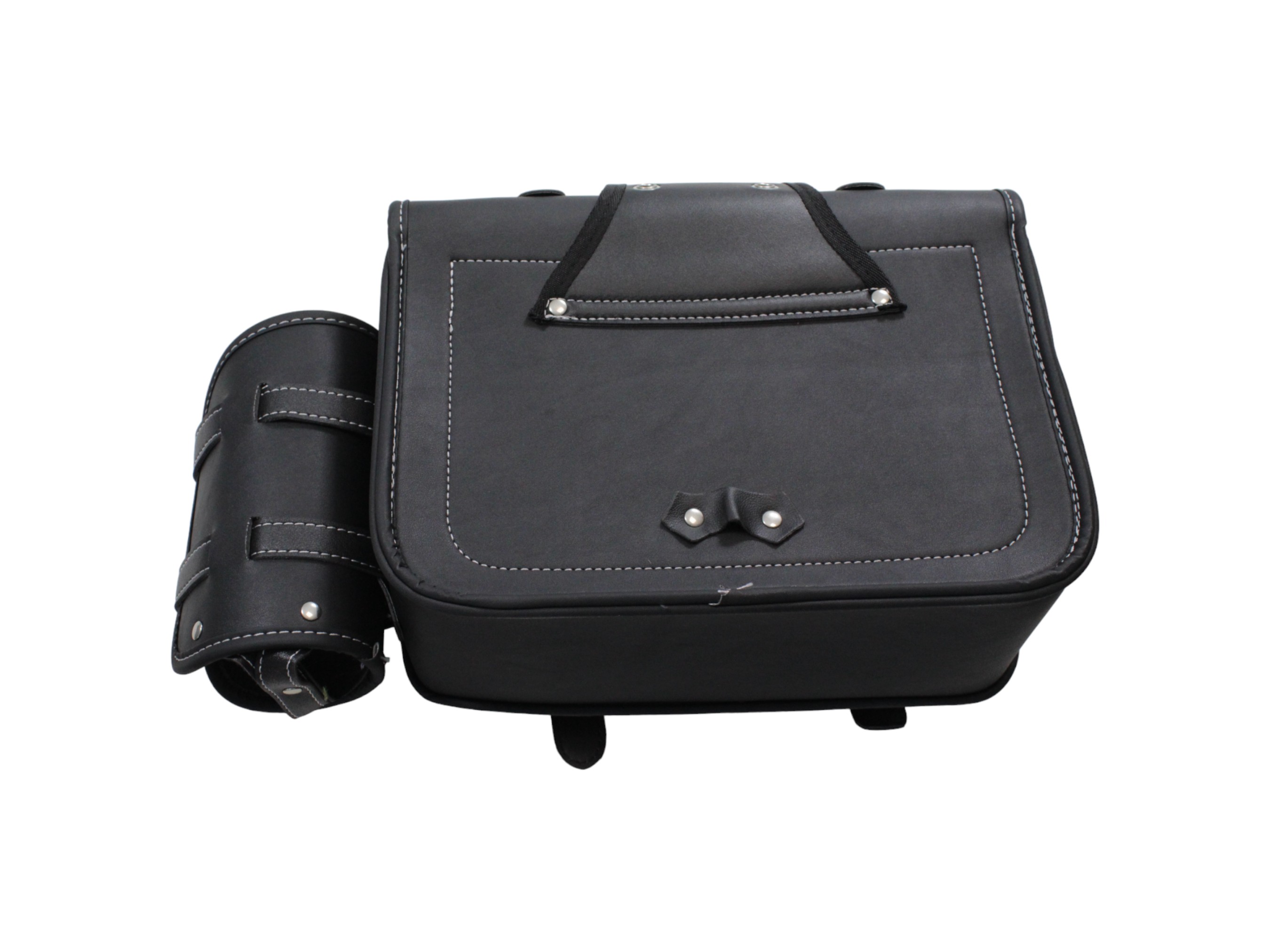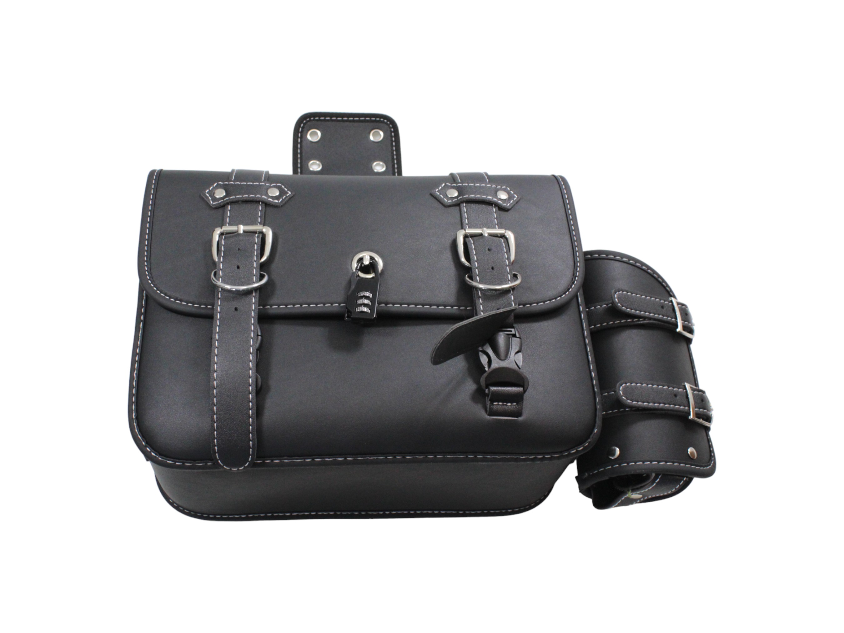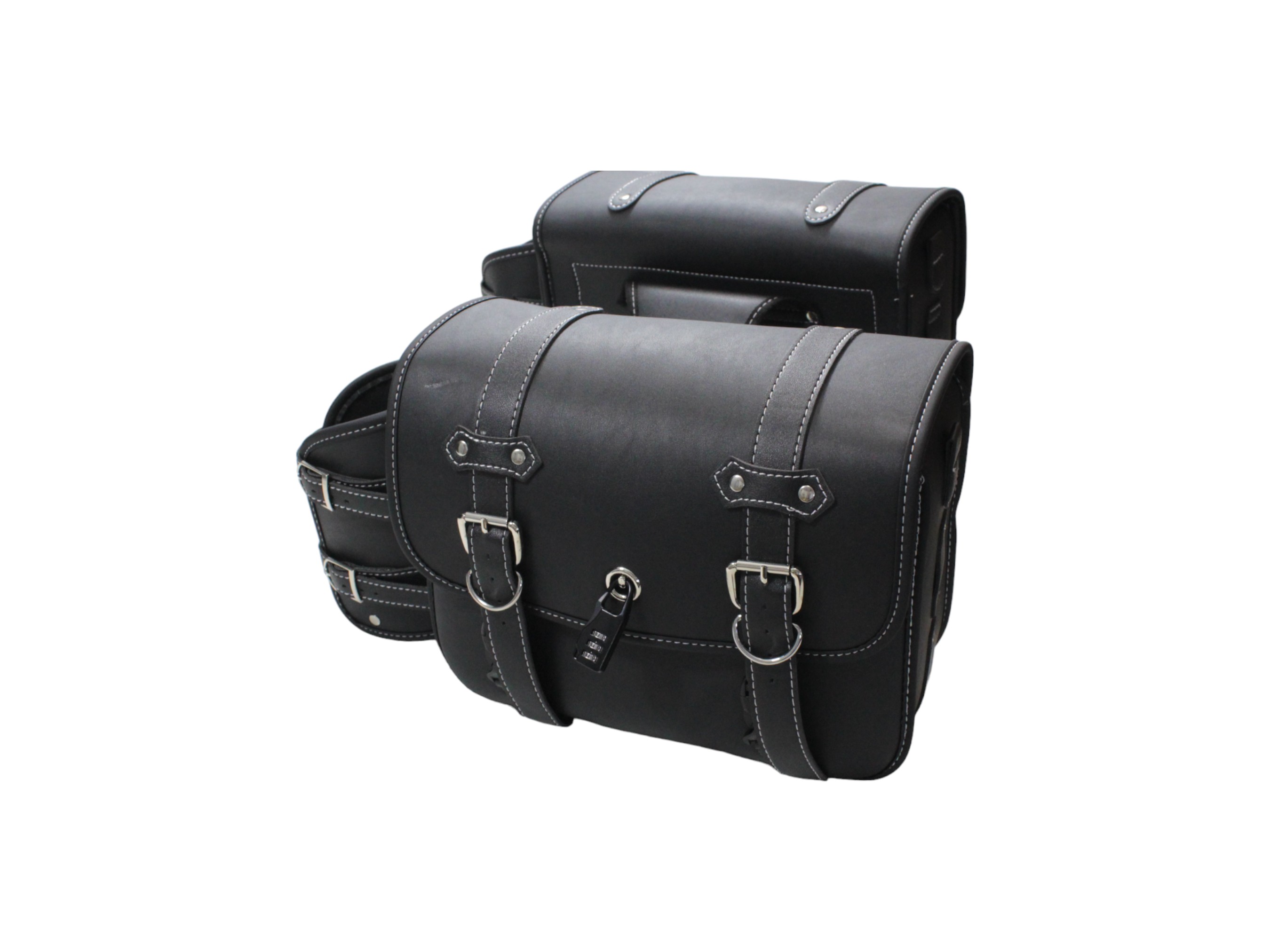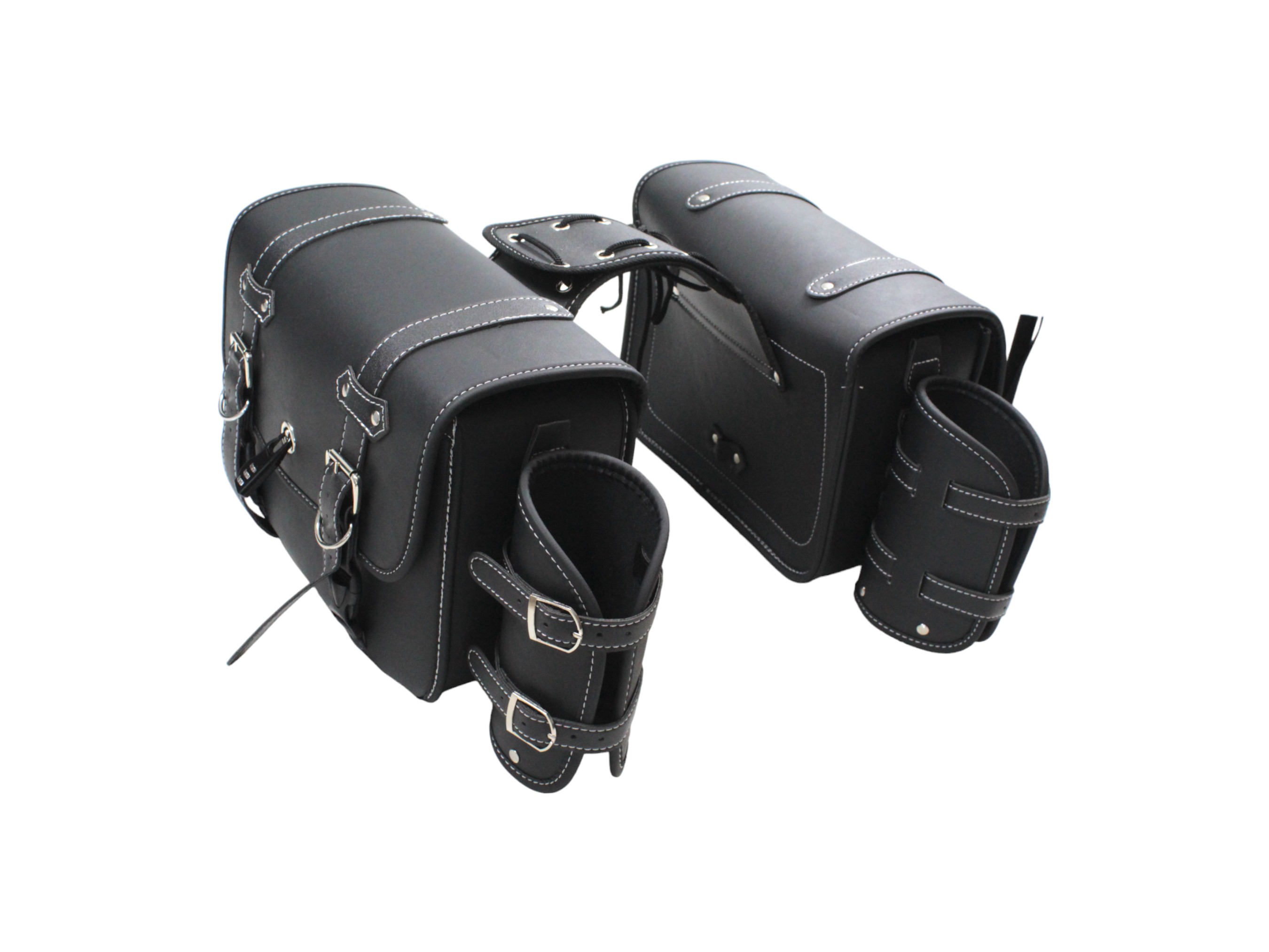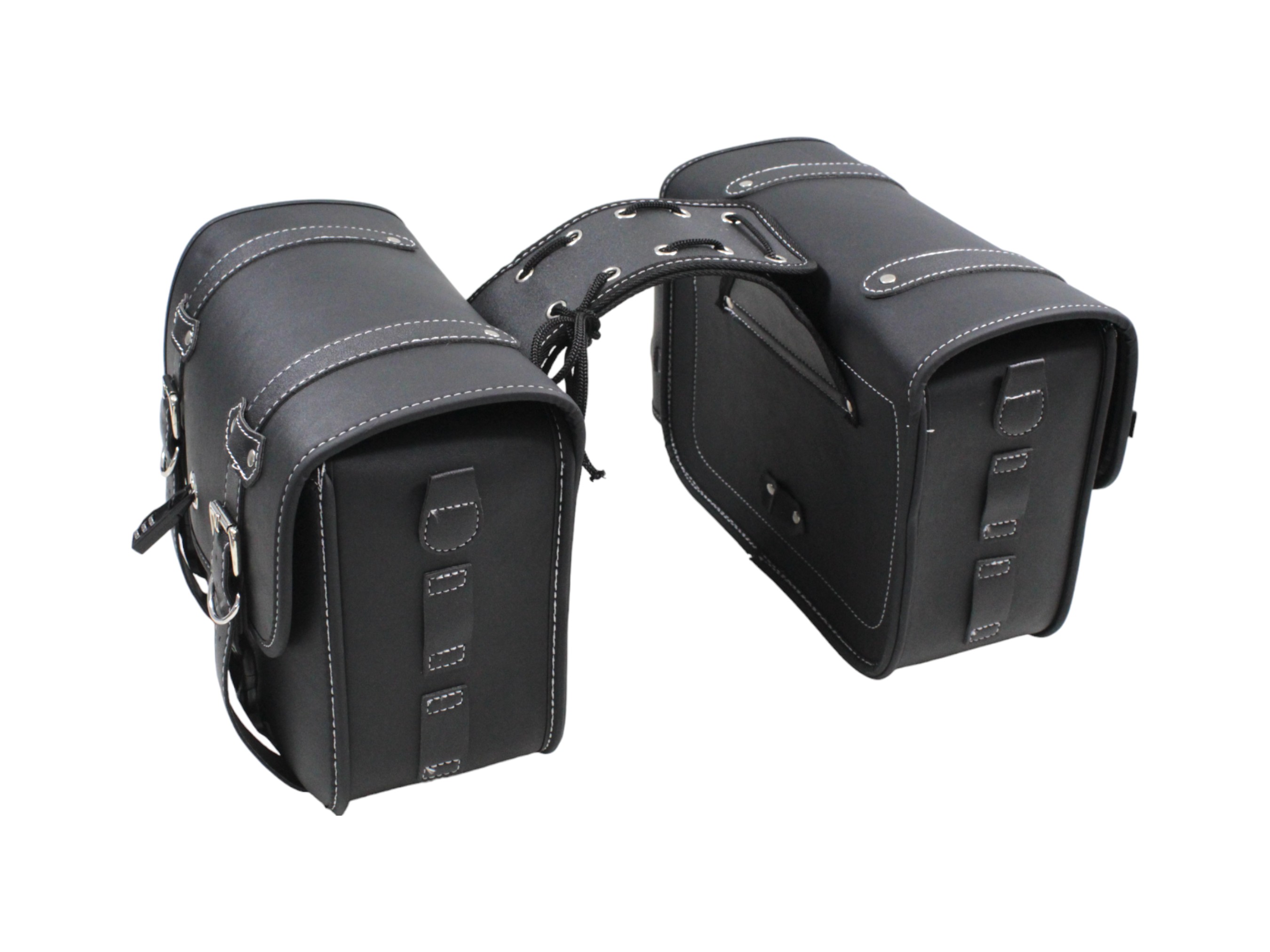 Sakwy wykonano z odpornej na przetarcia i wilgoć ekoskóry w kolorze czarnym. Ich usztywniona konstrukcja zapewnia stabilny kształt nawet przy pełnym obciążeniu, a metalowe okucia i solidne przeszycia gwarantują długą żywotność. Klasyczny wygląd w stylu retro idealnie komponuje się z motocyklami typu chopper, cruiser, cafe racer czy custom.