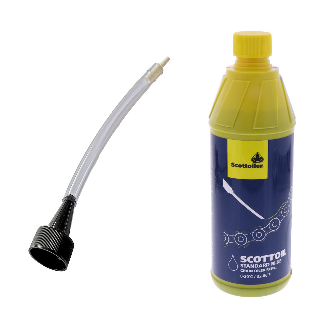 - Specjalny wężyk do napełniania z odpowietrzeniem. Pasuje do pojemności butelek z olejem do smarowania łańcuchów SCOTTOILER.