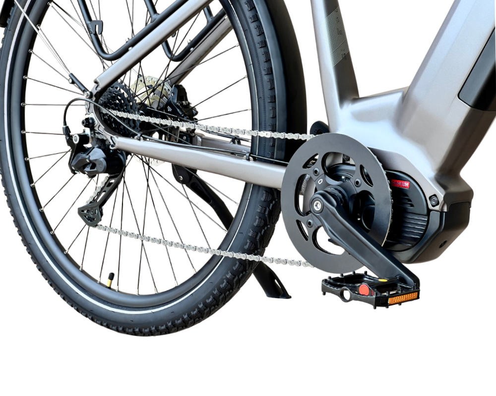Centralnie zamontowany silnik Bafang zapewnia płynne i naturalne wsparcie jazdy, a jego moc została dostosowana do przepisów (250W). Energię dostarcza wydajna bateria o zasięgu do 120 km, którą można łatwo wyjąć i ładować w dogodny sposób.