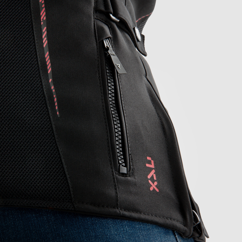 Za skuteczną wentylację kurtki JAX LADY odpowiada połączenie przewiewnych paneli 3D mesh oraz steel mesh. Dzięki temu powietrze swobodnie krąży wewnątrz kurtki, co zapewnia komfort nawet podczas jazdy w wysokich temperaturach.