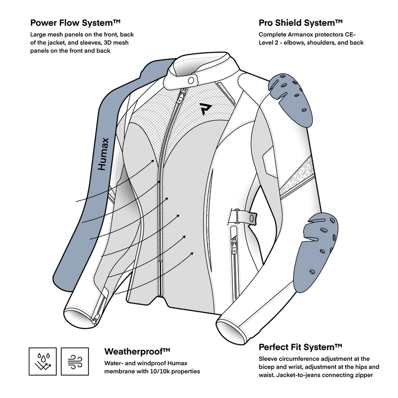 Wysokiej klasy materiały zastosowane w kurtce Rebelhorn JAX LADY zapewniają trwałość, ochronę oraz skuteczną wentylację nawet podczas jazdy w cieplejsze dni. Dodatkowo membrana HUMAX® o parametrach 10k/10k chroni przed deszczem i wiatrem, zachowując przy tym bardzo dobrą oddychalność.