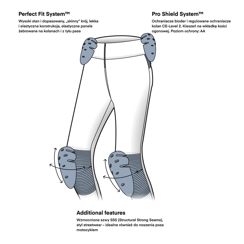 - Świetna alternatywa dla ciężkich jeansów motocyklowych – lżejsze i bardziej kobiece