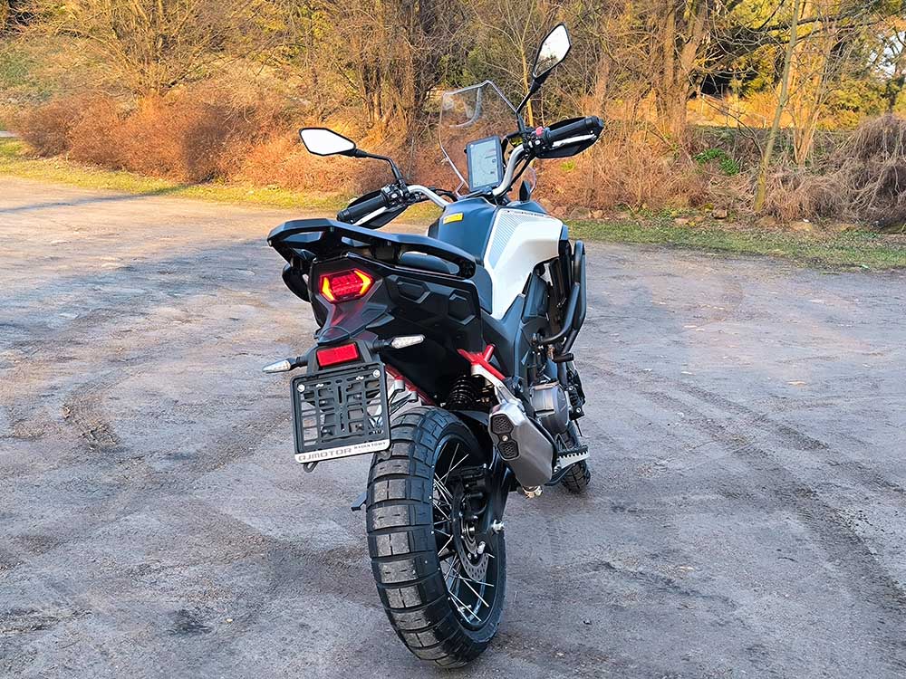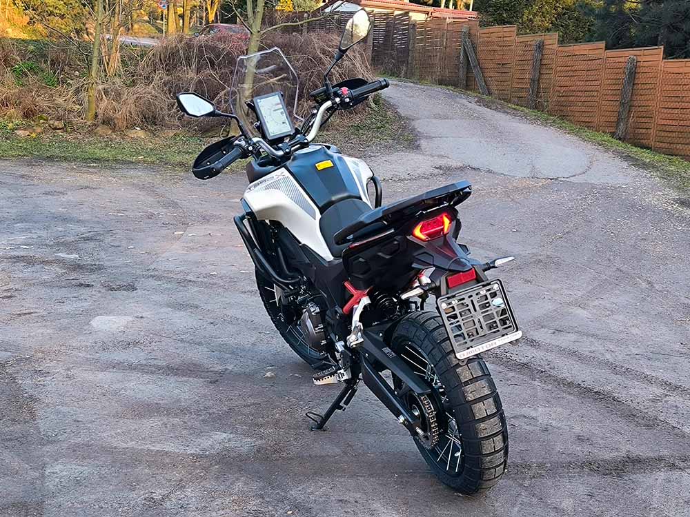 Morbidelli T352X wyróżnia się masą zaledwie 180 kg z płynami, co przekłada się na świetną kontrolę zarówno w mieście, jak i na szutrowych drogach. Długoskokowe zawieszenie – odwrócony widelec 41 mm z przodu oraz tylny amortyzator z układem dźwigniowym – zapewnia stabilność i komfort na nierównościach. Motocykl wyposażono w koła szprychowe z bezdętkowymi oponami Pirelli (19” przód, 17” tył), które gwarantują przyczepność i trwałość w zróżnicowanym terenie.