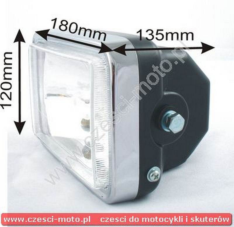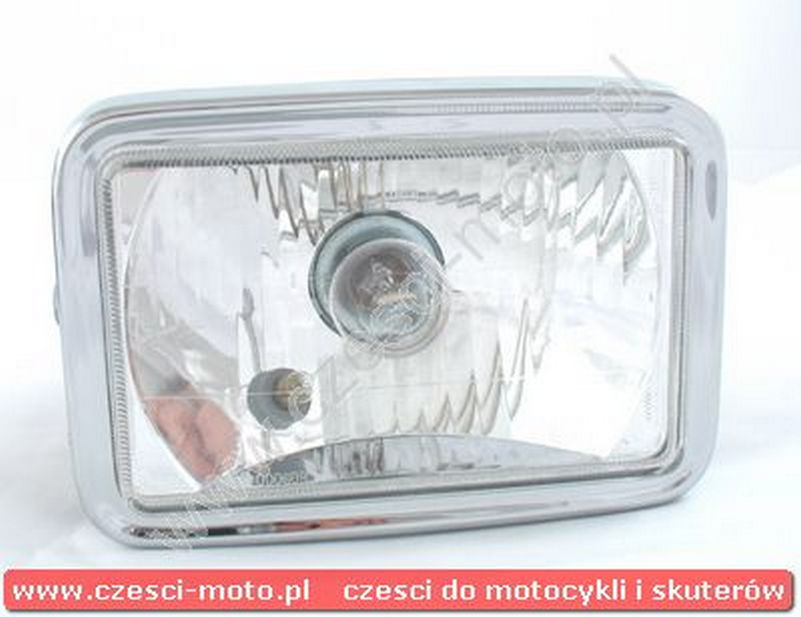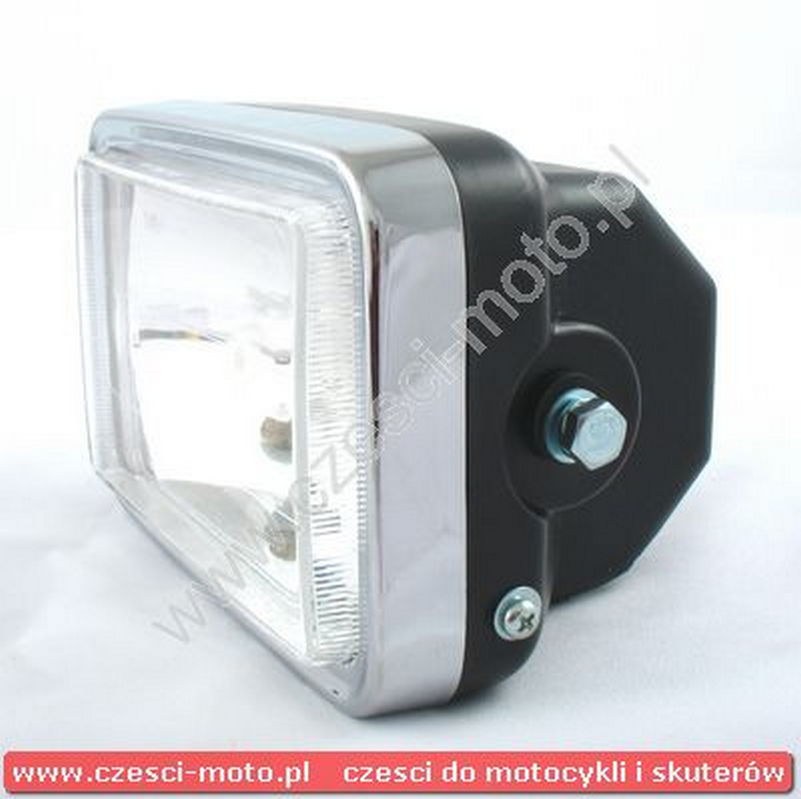 Lampa przednia, prostokątna z mocowaniem bocznym, obudowa czarna z chromowaną obwódką.